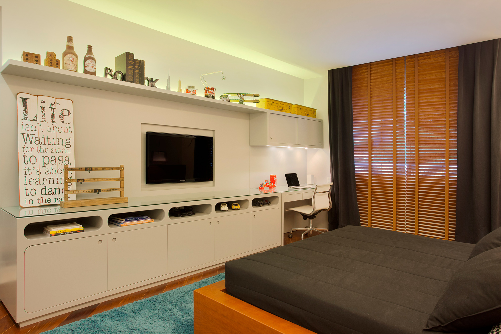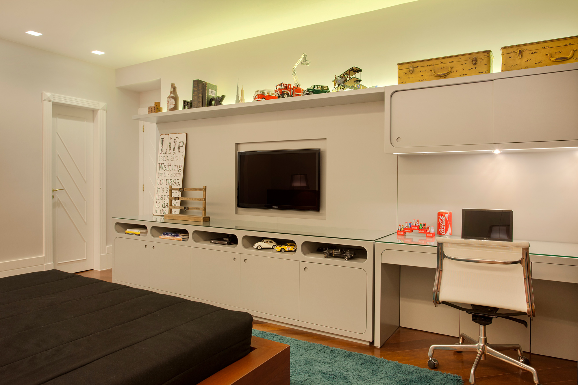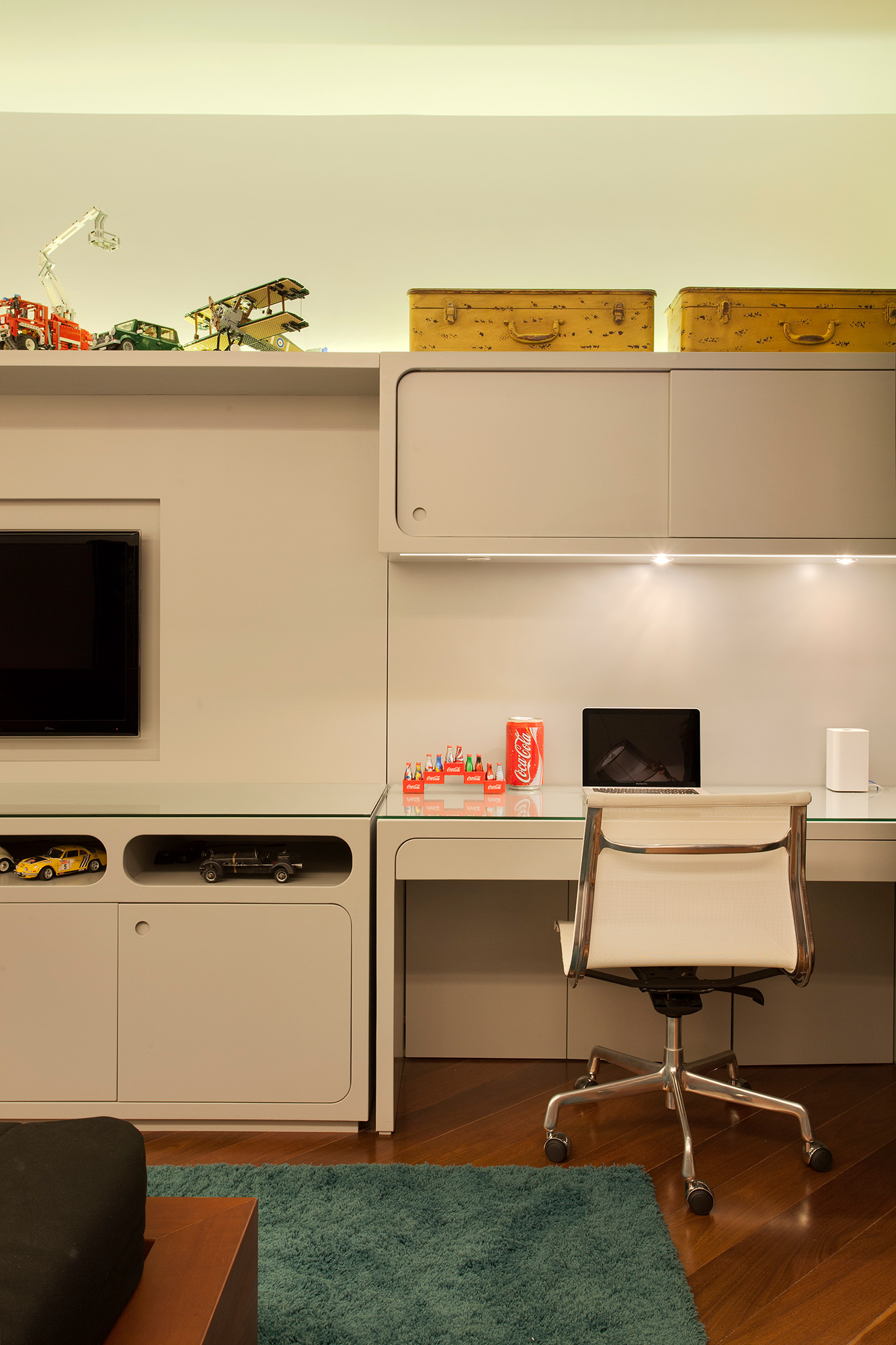 O colorido do tapete, dos itens de decoração e do acervo pessoal de objetos lúdicos compõe o espaço trazendo personalidade e história para o projeto.