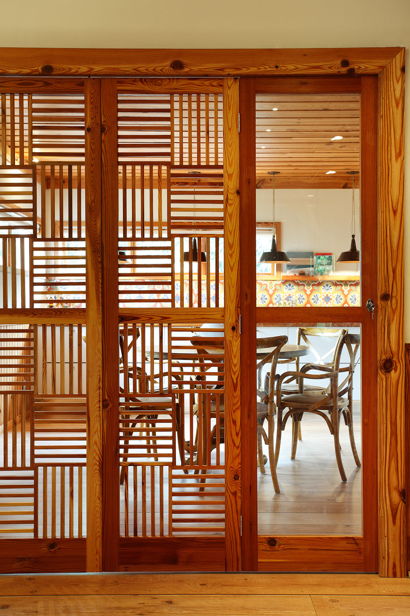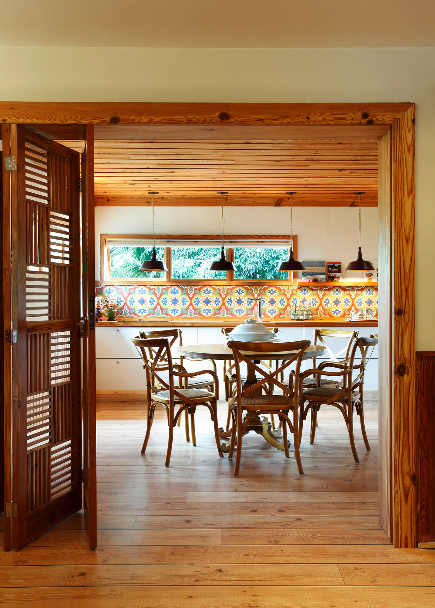 O piso em pinho de riga, original da casa da década de 70, e as paredes forradas em madeira e ladrilho hidráulico “vestem” o espaço e “abraçam” as 4 gerações que ali se encontram.