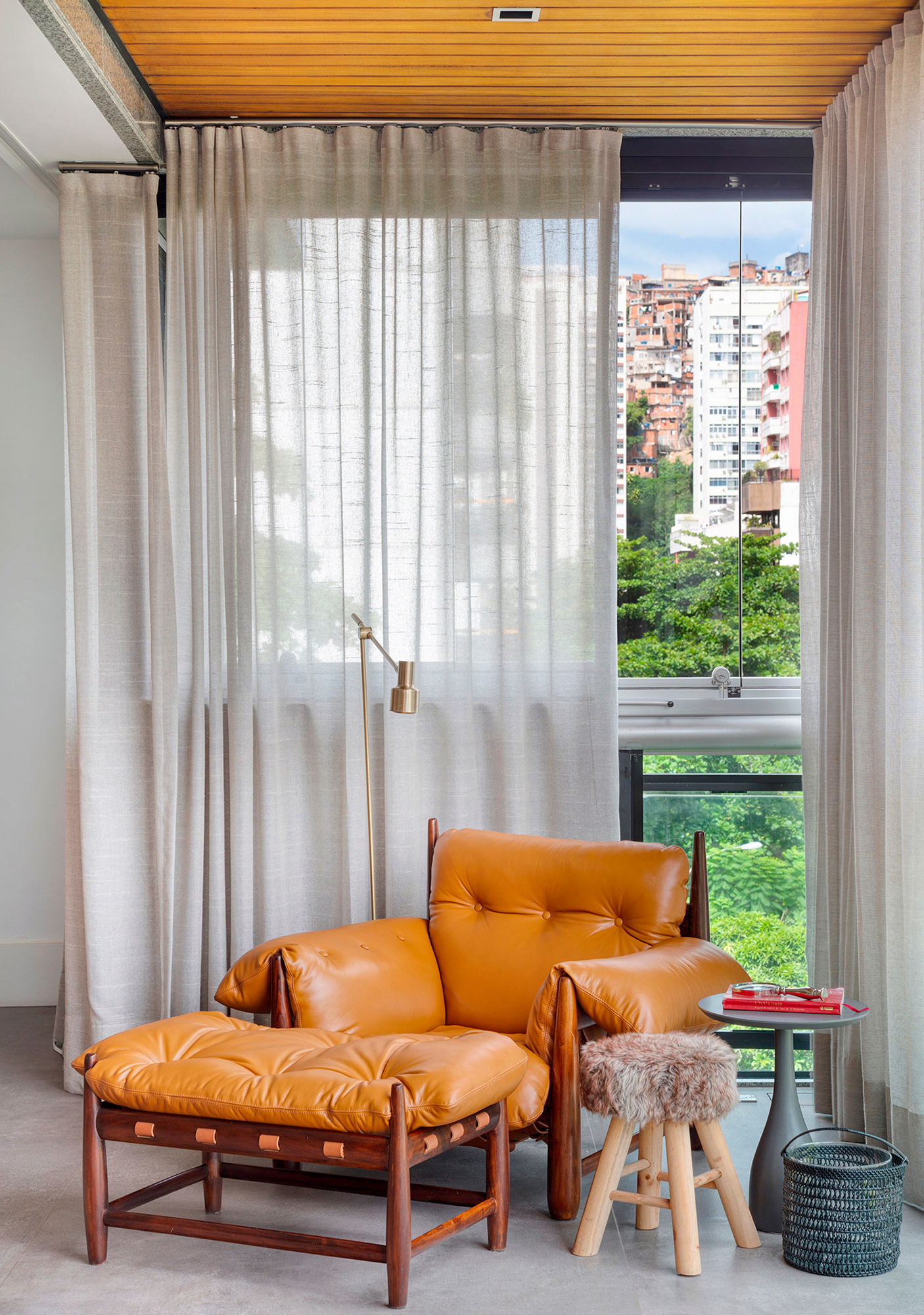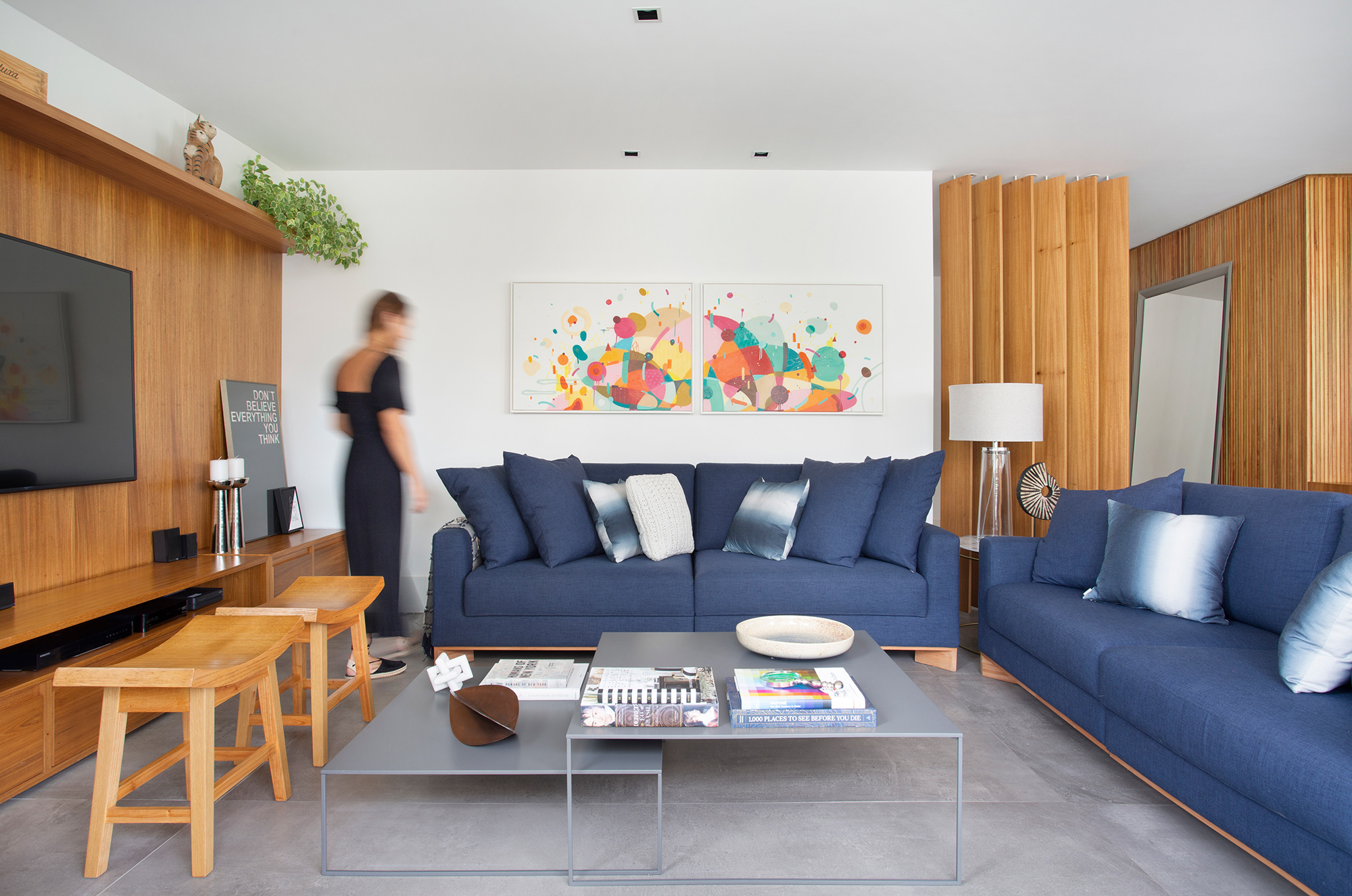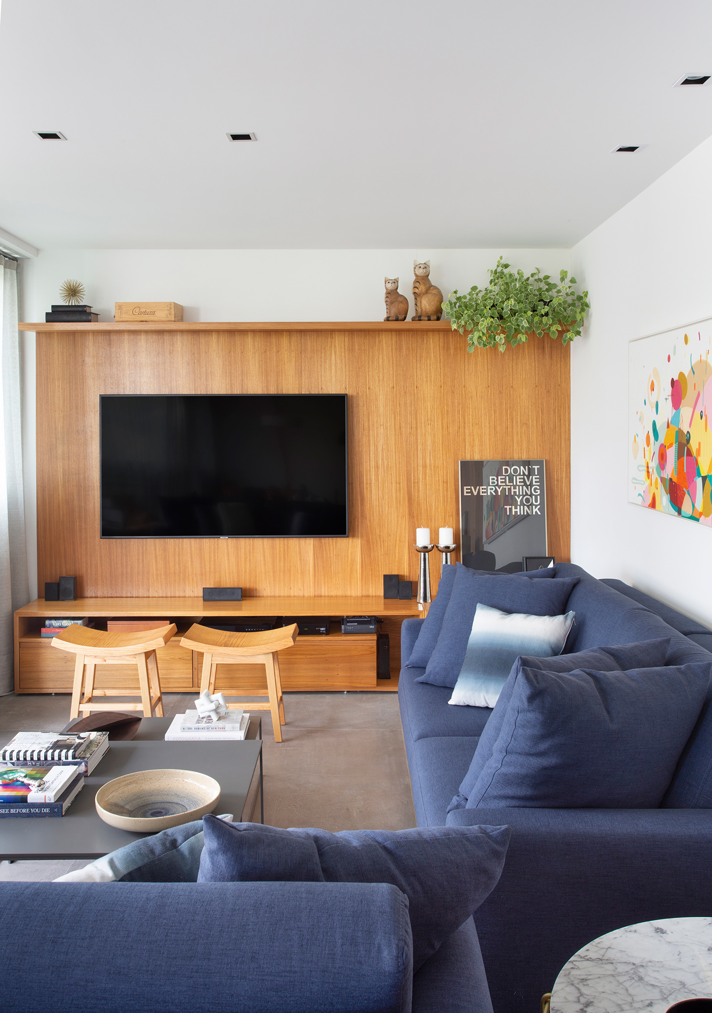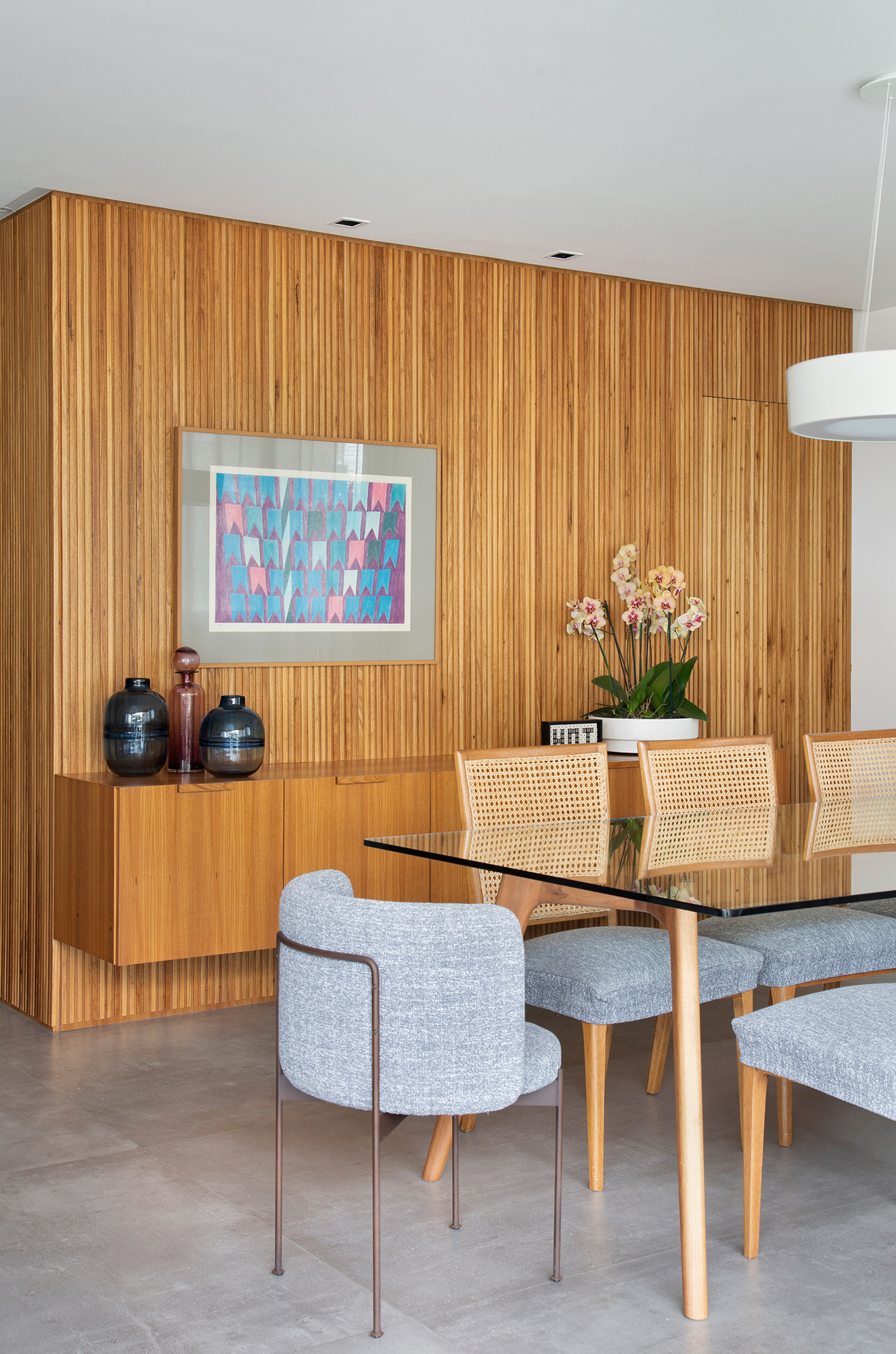 A escolha dos revestimentos, a ausência de tapetes e “abuso” da cor e da madeira para compensar o aconchego que eles trazem foram os principais recursos utilizados para entregar um apartamento prático, atemporal e com a cara dos sete donos!
