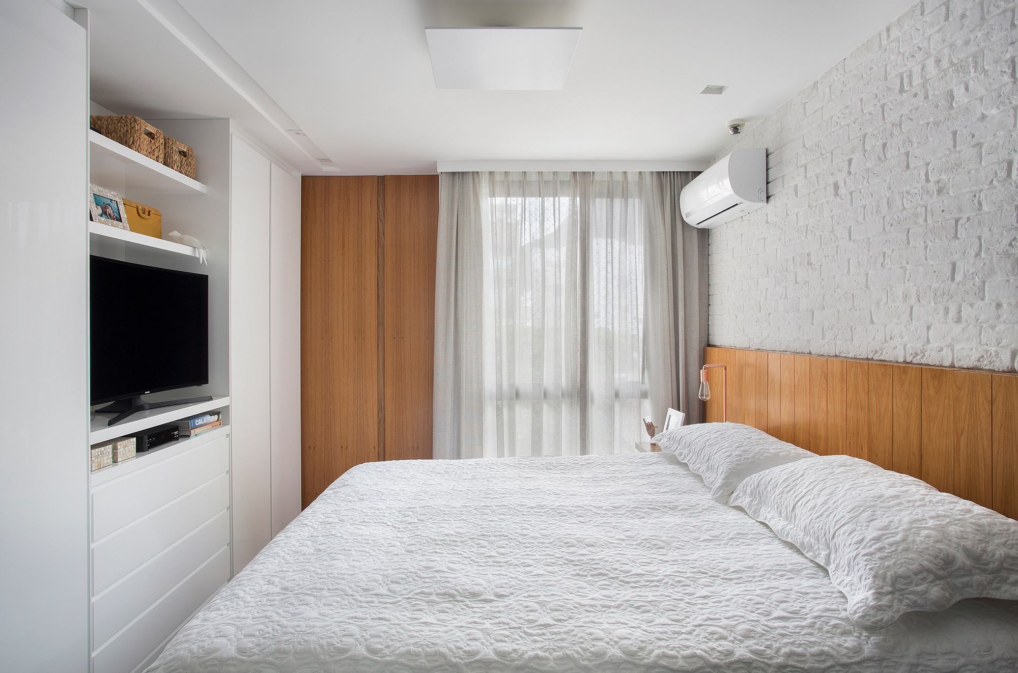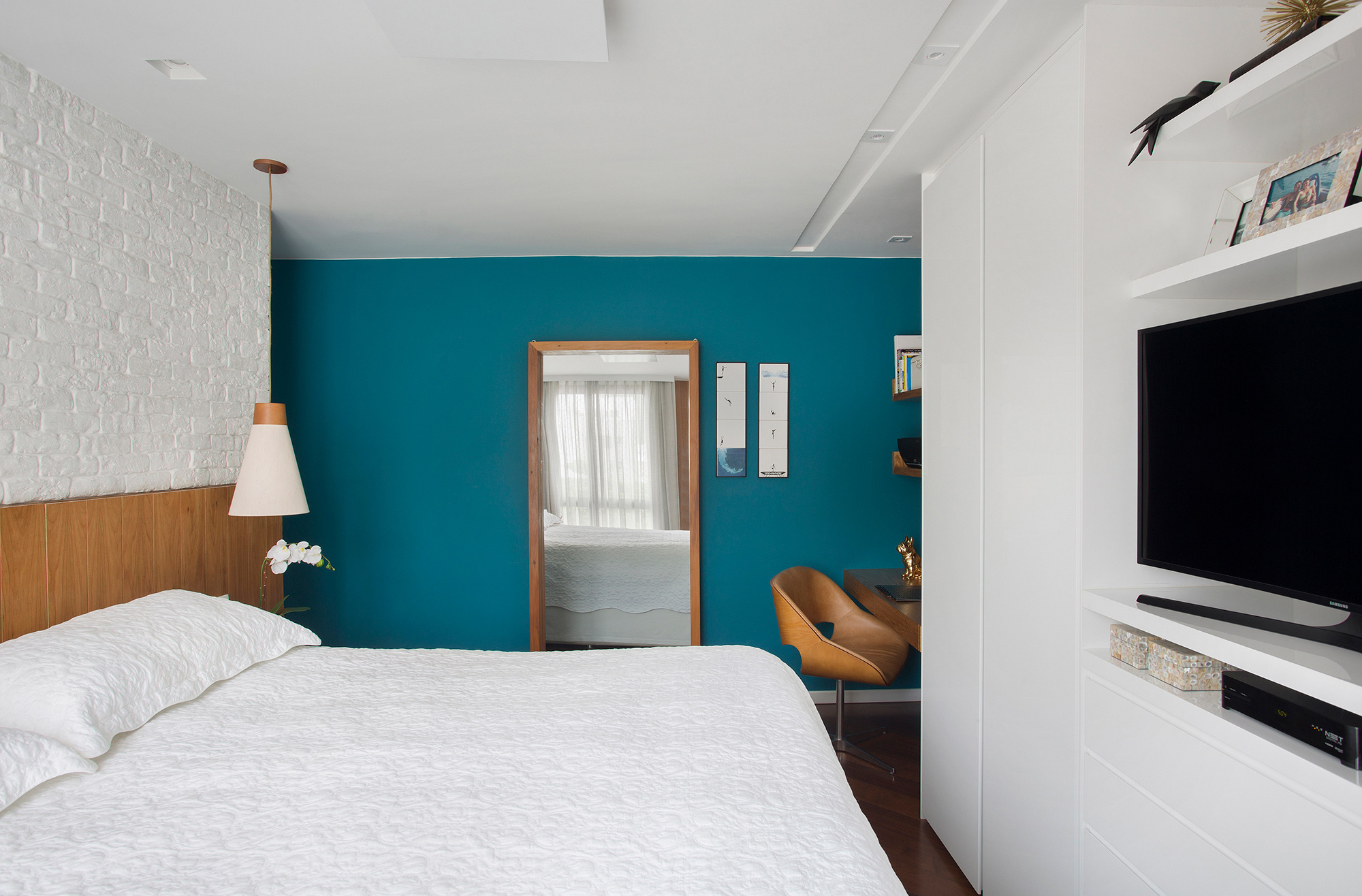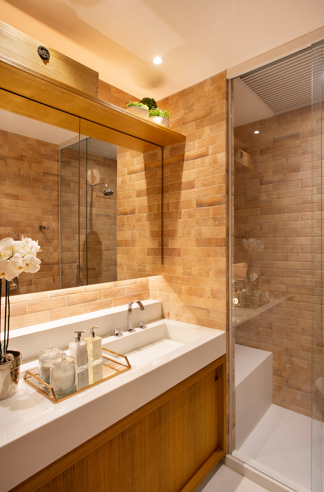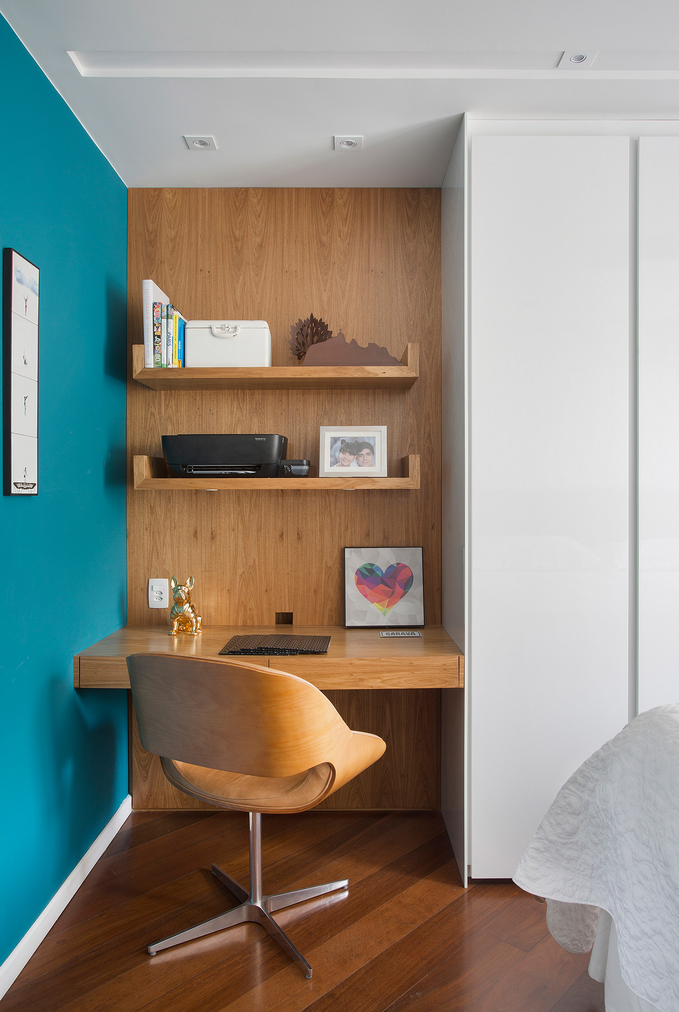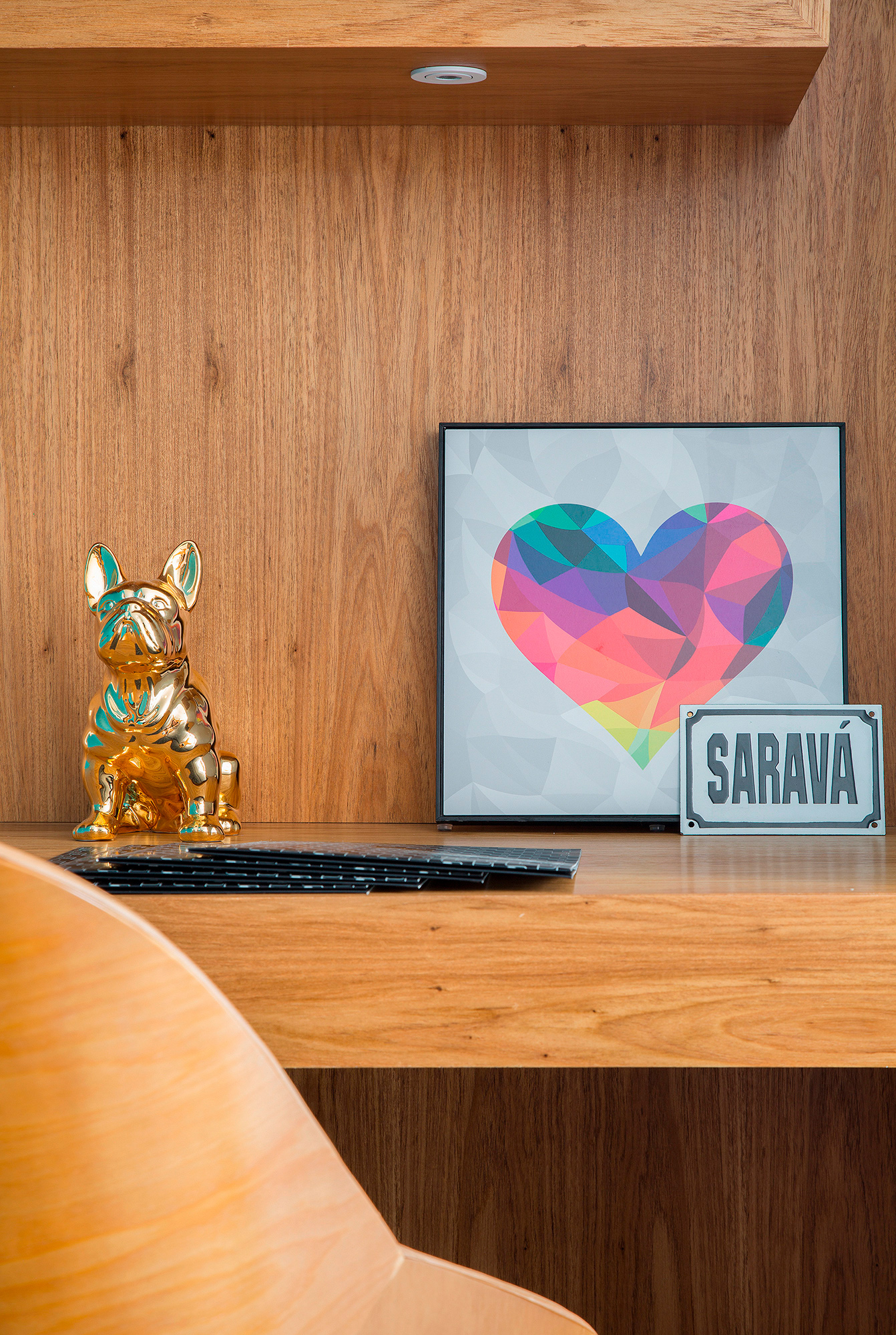 A escolha dos revestimentos, a ausência de tapetes e “abuso” da cor e da madeira para compensar o aconchego que eles trazem foram os principais recursos utilizados para entregar um apartamento prático, atemporal e com a cara dos sete donos!