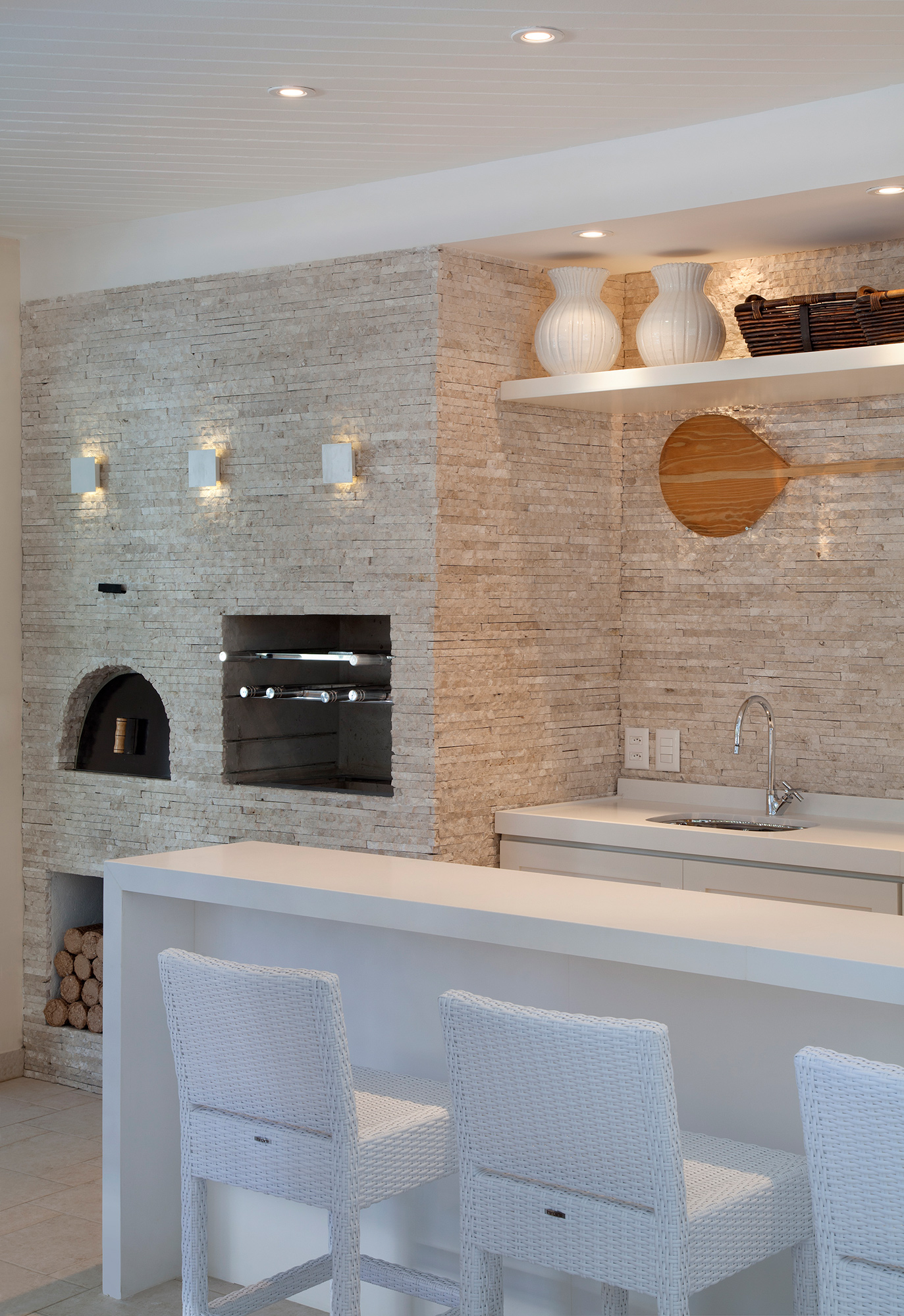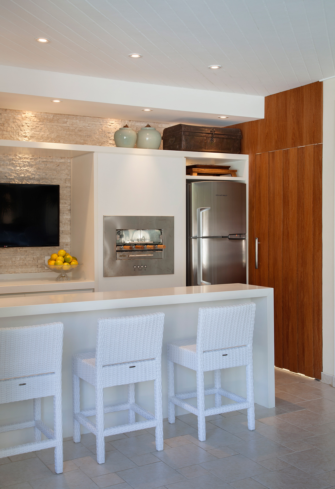 A planta original dessa casa, de medidas generosas, não contemplava um único espaço de convívio e lazer junto a piscina. O casal, com duas filhas pequenas, a tempos sonhava em ter um espaço para receber os amigos e a família. Com cuidadosa escolha de revestimentos, iluminação eficiente e respeito aos limites da área existente, uma extensa, estreita e subutilizada varandas e transformou em área gourmet. Composto por duas churrasqueiras, forno de pizza, televisão e grande mesa compartilhada, o espaço se tornou o lugar favorito da família.