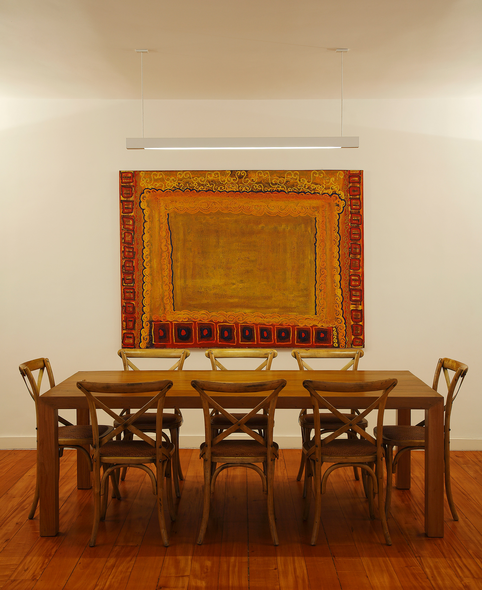 Com exceção do piso original em tábua corrida de peroba do campo e o pé direito alto, nada mais foi mantido.